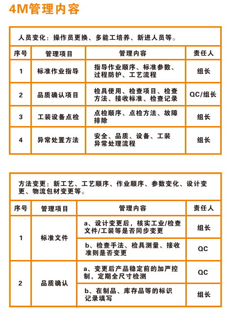 制造過程管理的核心是4M,即:人員管理、設(shè)備管理、材料管理、方法管理。一個穩(wěn)定的受控制的制造過程,是不會出現(xiàn)異常的。如果出現(xiàn)異常,那么一定是制造過程4M的某個要素發(fā)生了變化。因此,為了持續(xù)有效保持高效率生產(chǎn)與產(chǎn)品品質(zhì)穩(wěn)定性,就必需對4M變化進(jìn)行有效監(jiān)控。